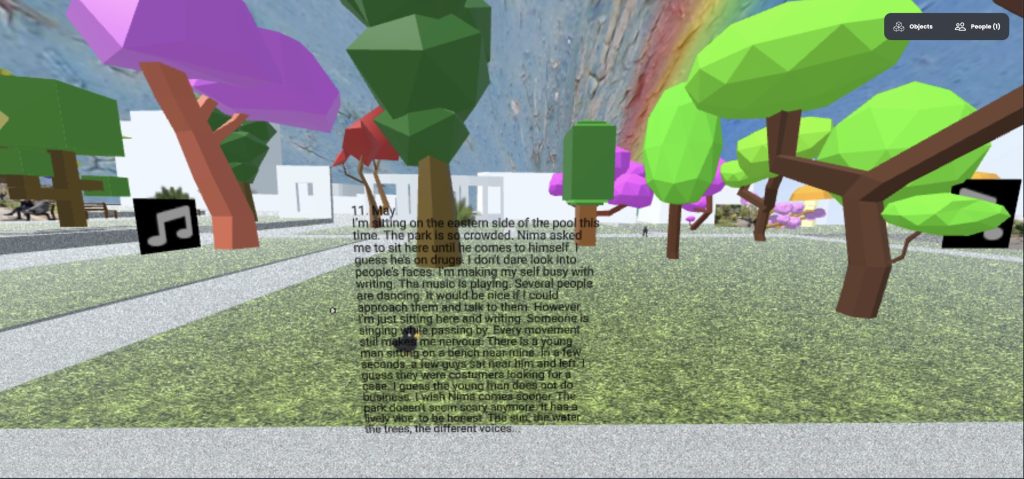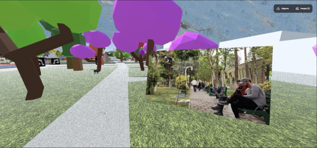 Located on Enghelab Street, one of Tehran’s most politically and historically significant streets, Daneshjoo Park has been a meeting place for the LGBTQ community, particularly gay and transgender individuals, since its establishment in 1967. Following the Islamic Revolution, the park has been subject to strict surveillance and various spatial interventions by the regime due to religious influence and the political climate, resulting in restrictions and the oppression of community members. Additionally, social stigma and discrimination have further marginalized these individuals, many of whom are also sex workers. Despite these challenges, the park remains one of the few gathering spots for sexual minorities to this day. The following project represents the park on an open-source virtual reality platform (Mozilla Hubs), featuring conversations with LGBTQ individuals from the park recorded in audio format during May 2022. The project includes videos and images capturing impressions of the location. The project’s primary goal was to provide a platform for people inside and outside Iran to hear these stories and raise awareness. Additionally, it aimed to create a safe virtual space for Iranian sexual minorities to meet and interact virtually. To ensure safety, the VR Park was not published publicly. Instead, private tours were conducted within the VR Park, accessible only to a limited number of participants each time.